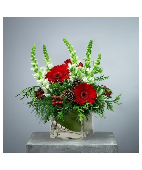 Make them "berry" happy. Berry and Bright will add cheer and whimsy to any occasion. Bright red gerbera daisies accented with red hypericum berries and pine cones in a low clear glass vase will accent any end table or coffee table.