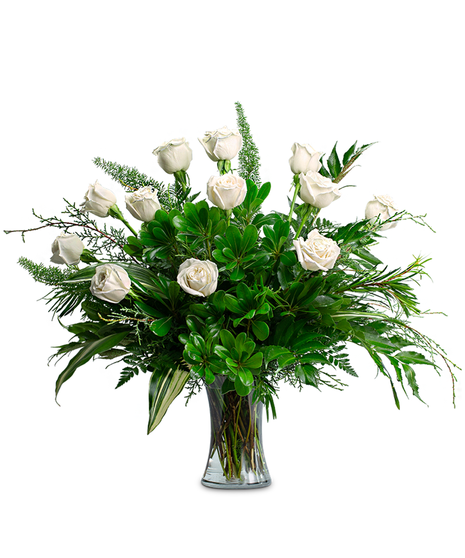 Elegance at its finest. Winter Pearls brings sophistication to the table. Pearly white roses, complemented by a graceful blend of foliage, fill a tall clear glass flared vase, perfect for an entry table.