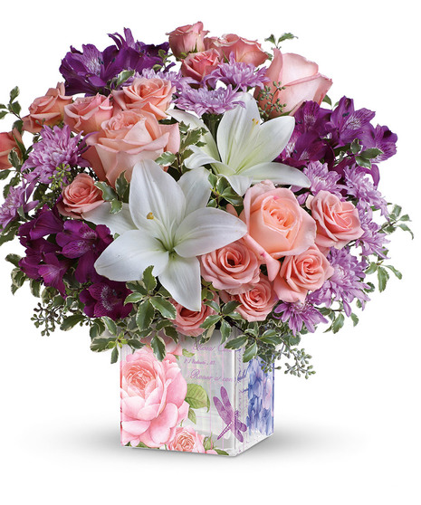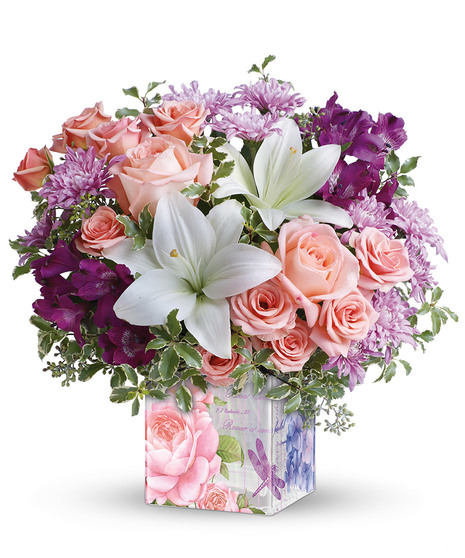 Imagine their joy when this grand gift arrives! Hand-delivered in a charming, vintage-inspired botanical cube vase, this lush arrangement of roses and lilies is reminiscent of a stroll through a stately English garden. It's just the thing to brighten any day!