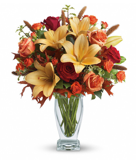 Absolutely exquisite! This bouquet is a fall flower fantasy come true. All the richness of this colorful season is captured in a stylish glass vase. So pretty, you might have to order one for a friend and one for yourself!