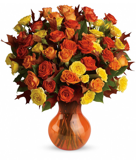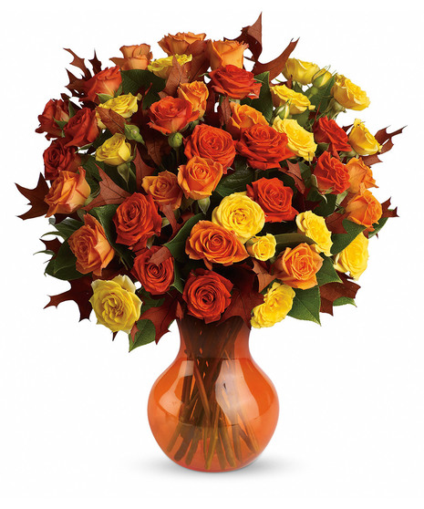 Autumn is a many-splendored thing, and this glorious bouquet is proof. The season's most amazing flowers in a chic serendipity vase - what a spectacular splash of color and style! Bask in it.