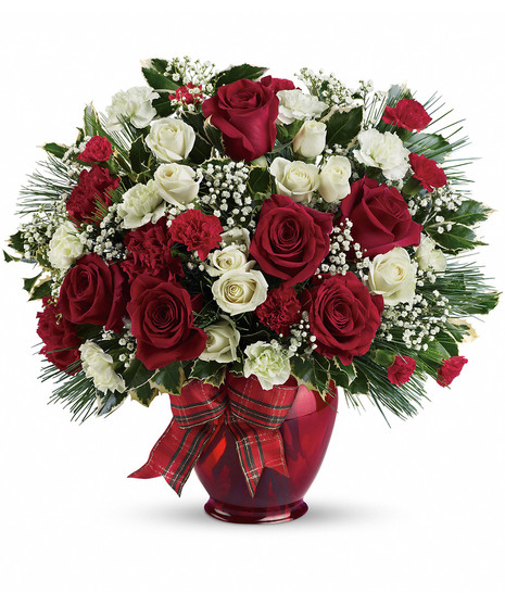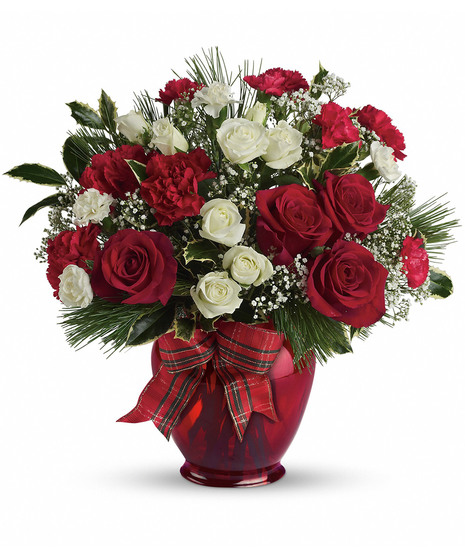 The splendor of the season is beautifully captured in this traditional holiday arrangement. The mix of blossoms, holiday greens and textures is a brilliant way to say Merry Christmas!