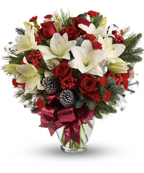 Take your holiday gift-giving to new heights with this dramatic bouquet! Classic red roses, snowy lilies and naturally festive berries and pine are gathered in a tall arrangement they'll long remember.