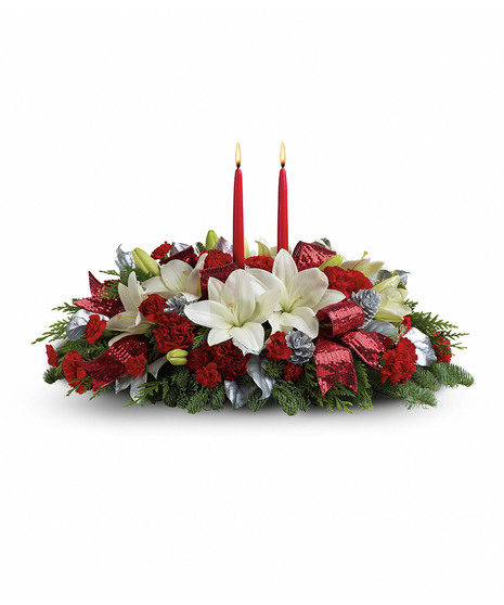 Shiny and bright! Holiday celebrations shine with this lush arrangement of snow white lilies and red carnations beautifully arranged with fresh holiday greens, silver pinecones and glistening red ribbon.