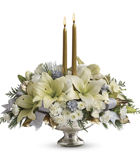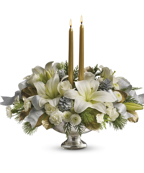 Inspired by the magic of the first snow, this elegant centerpiece of pure white lilies and winter greens, arranged in a stunning mercury glass bowl makes a fresh, fragrant addition to your holiday table, or a breathtaking gift for someone special.