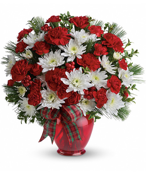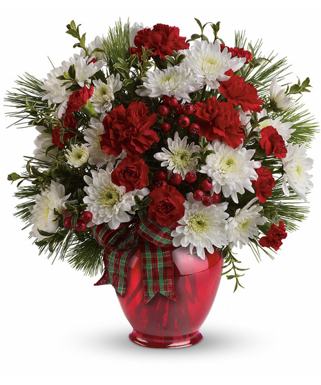 Spread the joy of the season with this merry bouquet of red and white blooms, winter greens and red berries in a ginger jar vase. What a fun gift to give and receive!