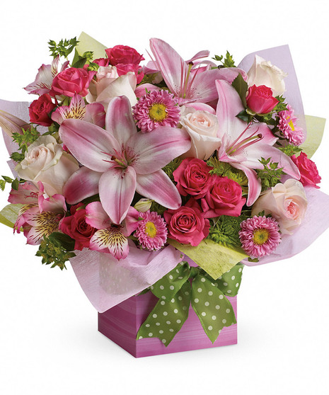 Quite possibly the prettiest pink present ever! A fantastic array of pink flowers in a hot pink gift box is contrasted brilliantly with bright green blossoms and a bow!