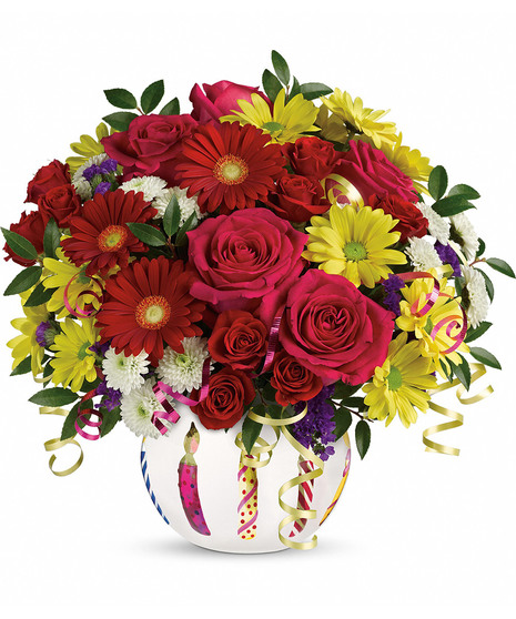 Make a wish! This party of petals is a birthday surprise they'll never forget. The fun, fabulous bouquet of roses and gerberas is lovingly hand-delivered in a bubble bowl adorned with adorable birthday candles for a special celebratory touch.