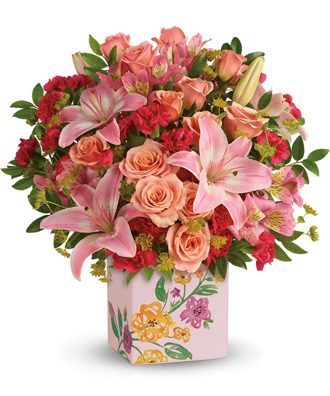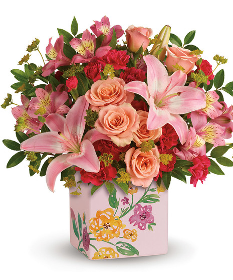 Glorious pink lilies and radiant peach roses send Mom your most heartfelt wishes for a happy Mother's Day! Presented in a keepsake ceramic cube, adorned with painterly blooms, it's two gifts in one for twice the fun.