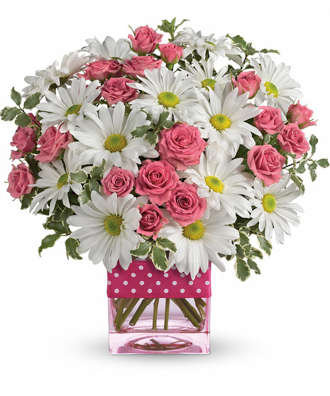 Polka dots and posies, they're the perfect pair. Well, at least in this pretty arrangement they are. Just the right flowers in just the right vase all wrapped up in you guessed it, just the right ribbon.
