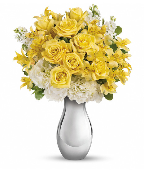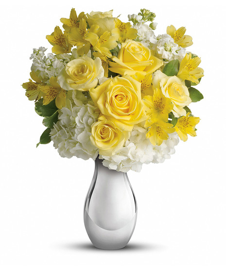 It's like sunshine and moonlight in are gloriously happy gift! Soft yellow roses, white hydrangea and other favorites showcased in a dazzling Silver Reflections vase. She'll love it - and so will her envious friends.
