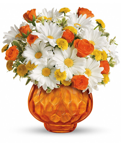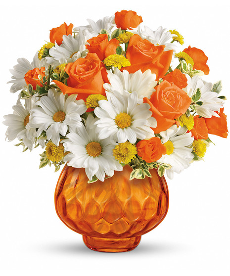Happy as a country sunrise, this delightful bouquet features orange roses and white daisies in orange cut-glass votive bowl. When the flowers are gone, they can light a candle and have indoor sunshine forever. They'll adore it.