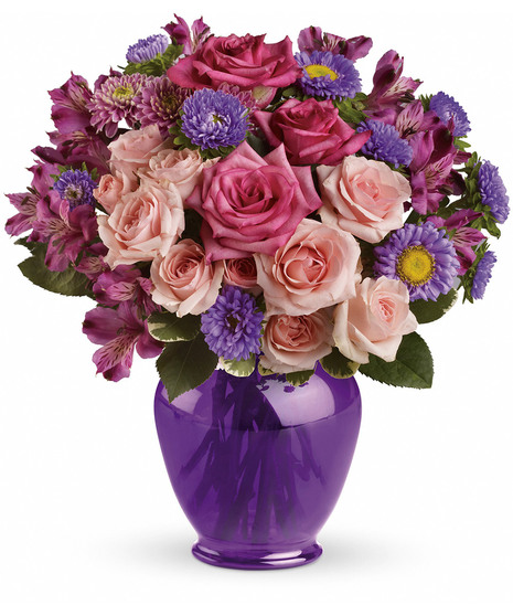 Impress someone special without depressing your budget. Send lush pink and lavender flowers in a classic purple ginger jar.