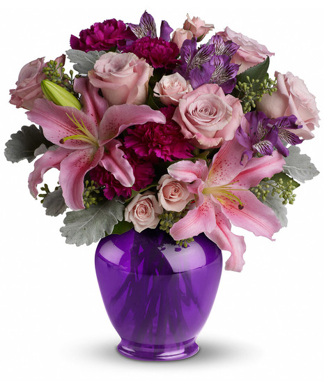 Take their breath away with a spectacular array of pink roses and lilies in a classic ginger jar in deep royal purple. Truly a stunning gift, but without a stunning price tag.