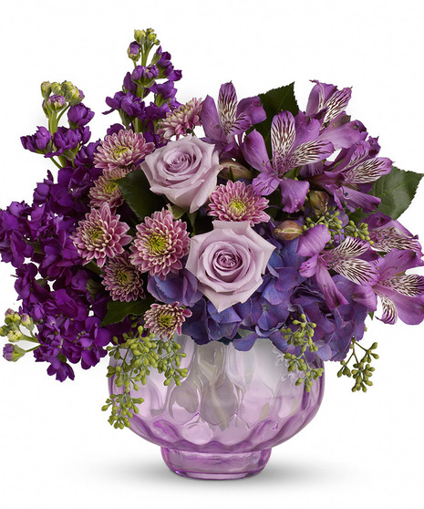 Delightfully dramatic, this gorgeous array of lavender and purple flowers in a lavender cut-glass votive bowl makes an enchanting gift. They'll love the flowers and bask in the glow of lavender candlelight for years to come.