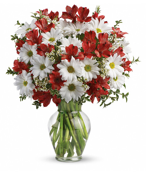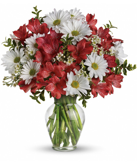 Daisy days are here again! Reconnect with an old friend by sending this enchanting array of white daisies and red alstroemeria in a sparkling clear glass vase. They'll love it - and you! Expect a phone call.
