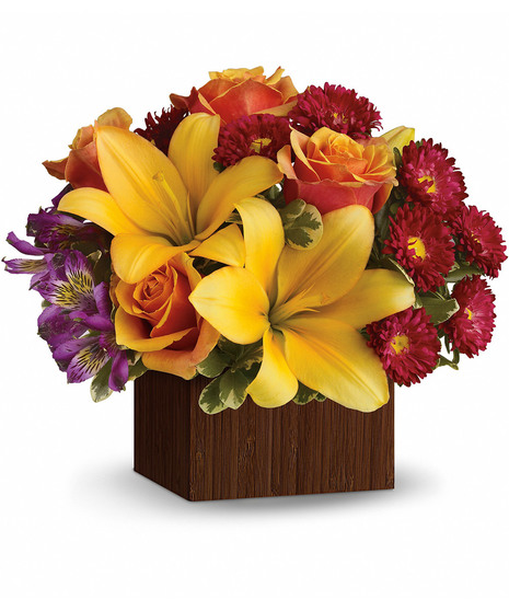 Arranged in a modern bamboo box, this stylish bouquet evokes the warm-hearted laughter of an island getaway. It's a cheerful choice for any occasion, from birthdays to hoorays!