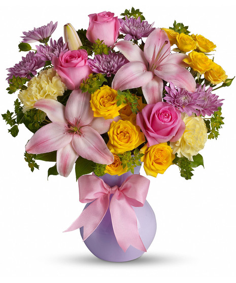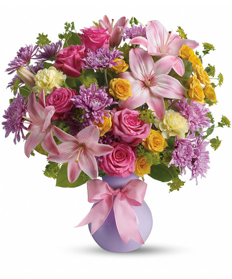 "Graceful and gorgeous" describes this stunning array of pastel flowers in a charming lavender vase tied with a pink satin ribbon. It's almost too pretty for words. But you'll hear many words of praise for sending it.