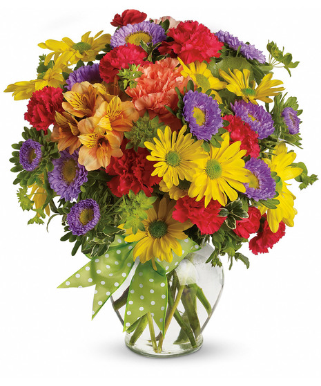 A summery mix of yellow daisy chrysanthemums, purple asters and red and orange carnations - arranged in a clear ginger vase and adorned with a cheerful green plaid bow - will make their wishes come true!