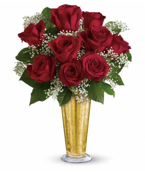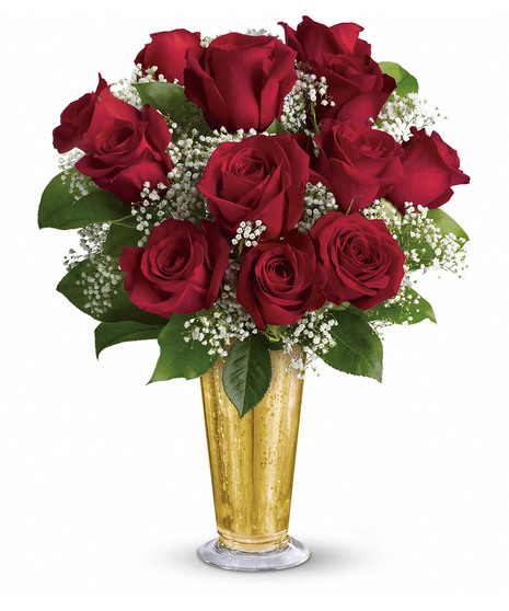 Rich red roses and golden mercury glass are a vision of classic romance! Steal her heart again with this loving tribute!