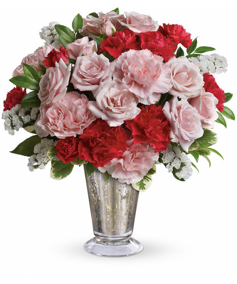Send someone special a sparkling token of your affection with this gorgeous pink and red bouquet. Romantic as can be, the mix of roses and carnations is beautifully arranged in a chic mercury glass vase. It's an instant classic!
