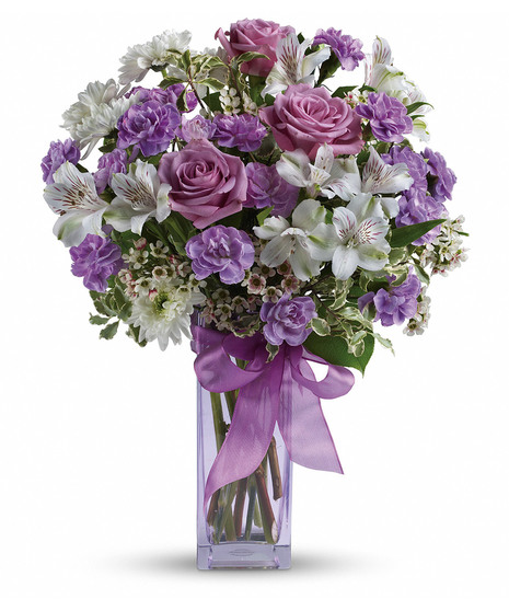 Fill her heart with laughter! The ultimate lavender-lover's bouquet, this gleeful gift of white and lavender blooms is delivered in a pretty pale lavender vase she'll cherish forever. Lavender organza ribbon adds that gifting touch.
