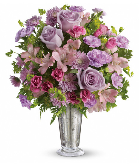The essence of femininity. Delight her with flirty-fun lavender and pink blooms presented in a gorgeous Mercury Glass julep vase. It's a gift that will sparkle in her memory forever.