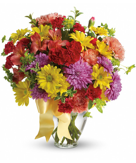 Color her overjoyed when this beautiful bouquet is delivered to her door! Sunny reds, oranges and yellows create a heartwarming mix to remind her just how special she is.