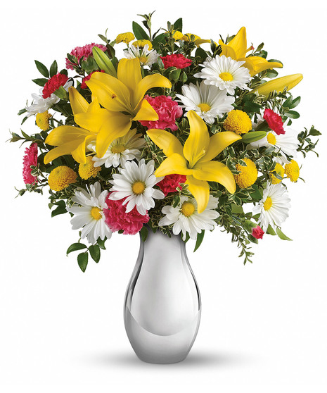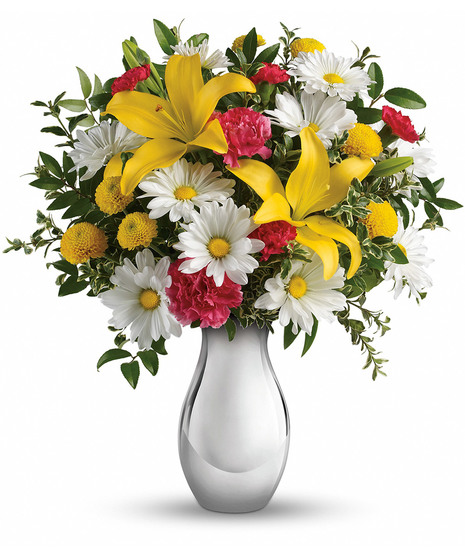 Won't she be tickled? Sure to put a smile on her face, this happy bouquet greets her with hot pink carnations and crisp white daisies arranged in a stunning Silver Reflections vase.
