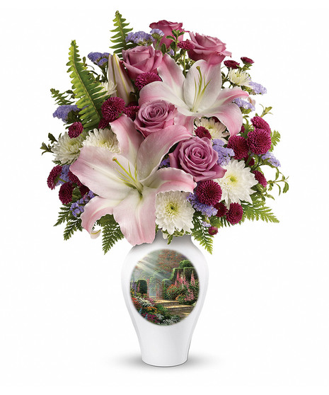 Lush, fragrant lilies and lovely lavender roses capture the beauty of a glorious garden to soothe the soul. Perfectly complemented by a ceramic vase featuring Thomas Kinkade's best-selling Garden of Grace painting, this is a gift they'll never forget.