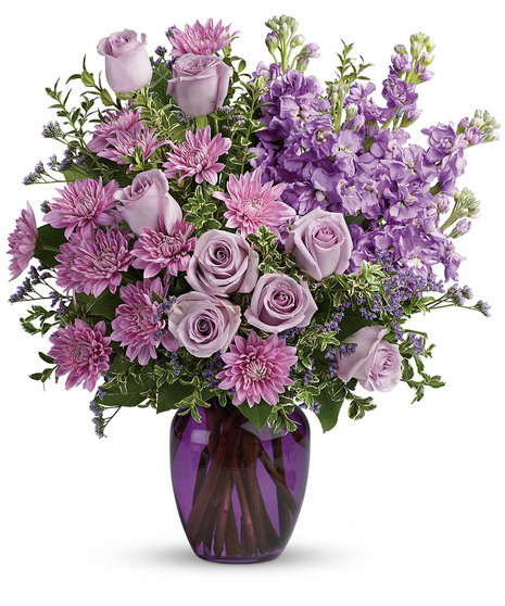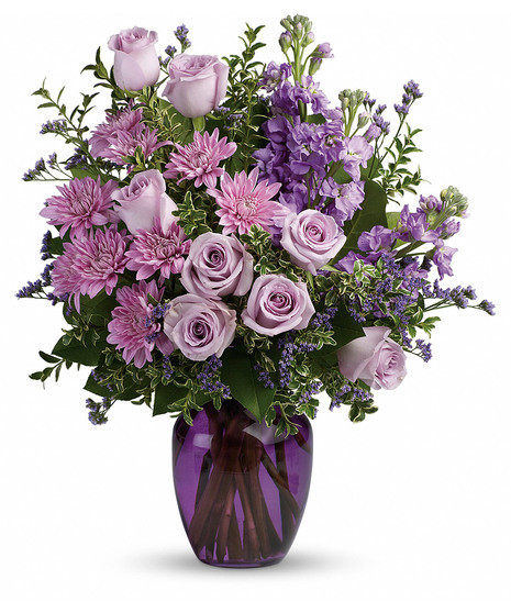 Capture the magic of togetherness with this bountiful bouquet of enchanting lavender roses. Artfully arranged in a glass vase, its twilight hues are sure to brighten anyone's day!