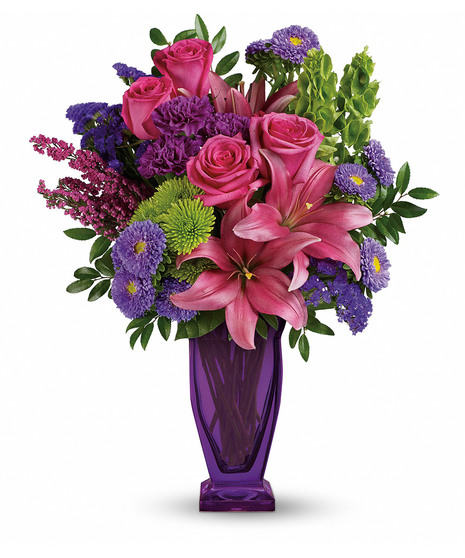 Shine bright! Make their eyes sparkle with this luxe bouquet of roses and lilies in stunning gemstone shades. Exquisitely designed and hand-delivered in an exclusive violet Couture vase, it's a grand gift they'll always remember!