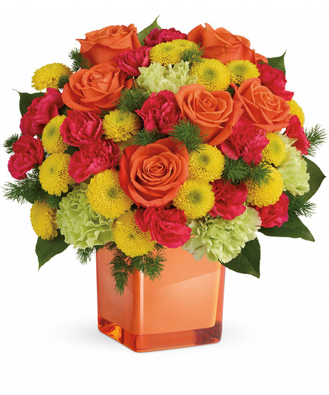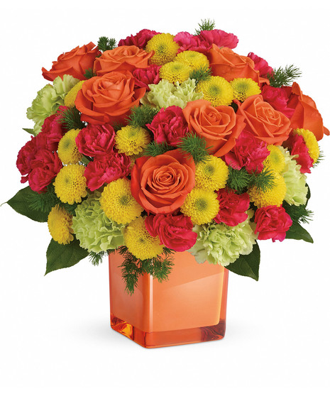 They brighten your days with their friendship and love, brighten theirs with these bold and beautiful blooms! Hand-delivered in a stylish glass cube, a gift in and of itself - this spirited mix of roses, carnations and mums is sure to make them smile!