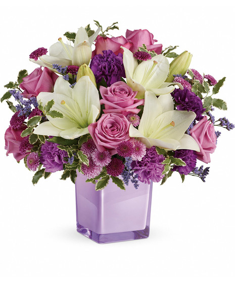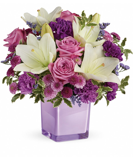 These luxurious lavender roses and crisp white lilies are poised to please! Perfectly presented in a stylish cube vase, it's an any-occasion surprise they'll never forget!