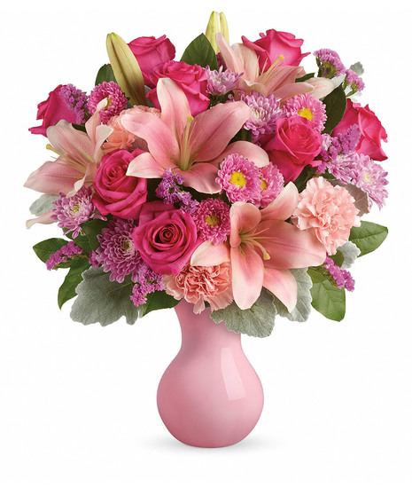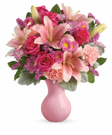 Inspired by the beautiful blush of happy cheeks, this fabulous mix of roses, lilies and carnations, presented in a pink keepsake vase, will make them feel like the extra special person they are!