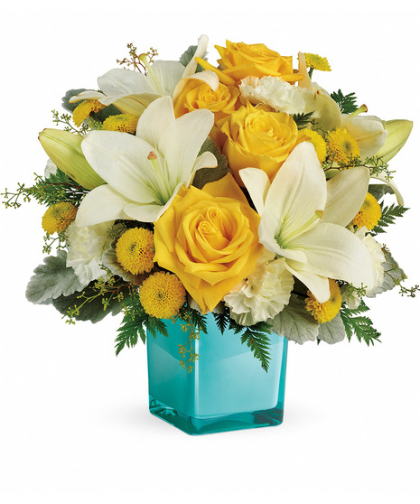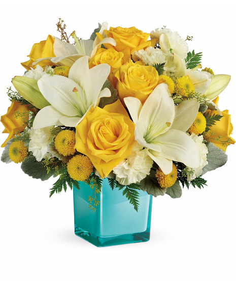 Inspired by the sunny sound of children's laughter, this lighthearted bouquet of golden roses and fragrant white lilies is presented in a stunning aqua cube vase. What a stylish way to make someone smile!