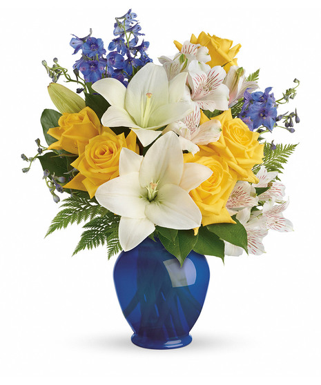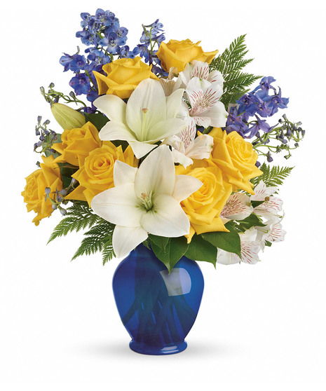 Treat them to a day at the shore, in the comfort of their home! This invigorating mix of yellow roses, white lilies and blue delphinium captures the spirit and shades of the shoreline. Hand-delivered in a bold blue ginger jar, it's a delightful gift any time of year!