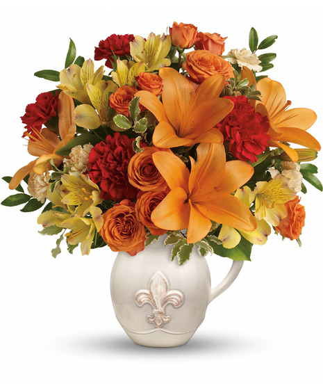 Capture the lovely warmth of summer with this gorgeous arrangement. Orange spray roses and asiatic lilies arrive in our charming French country ceramic pitcher.