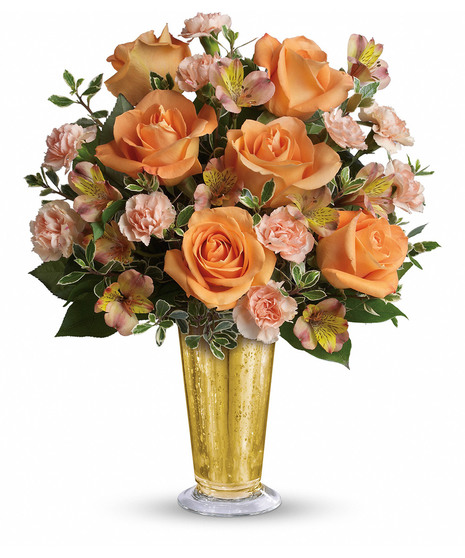 This gorgeous bouquet includes orange roses and orange alstroemeria arranged to perfection in our gold mercury glass julep.