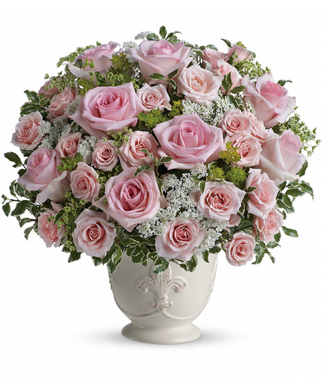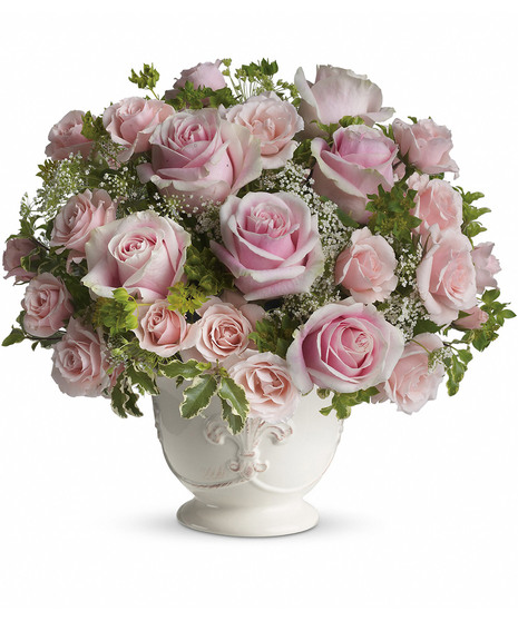 Named after the most romantic city in the world, this pretty rose arrangement delivers romance ever so beautifully. Light pink roses symbolize femininity, elegance and refinement, especially when they are perfectly arranged in a white French country pot.