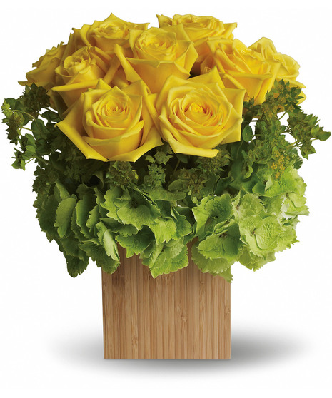 Let the sunshine in! This brilliant mix of flowers is hand-delivered in natural bamboo cube. You can't help feeling happy and warm all over just by looking at it.