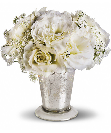 A petite expression of elegance, this angelic centerpiece pairs airy Queen Anne's lace with delicate lisianthus in an antiqued Mercury Glass Vase.