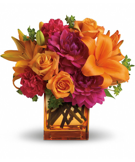 Hot times require haute arrangements. Look no further because this vibrant vase full of vivacious flowers has va-voom written all over it.