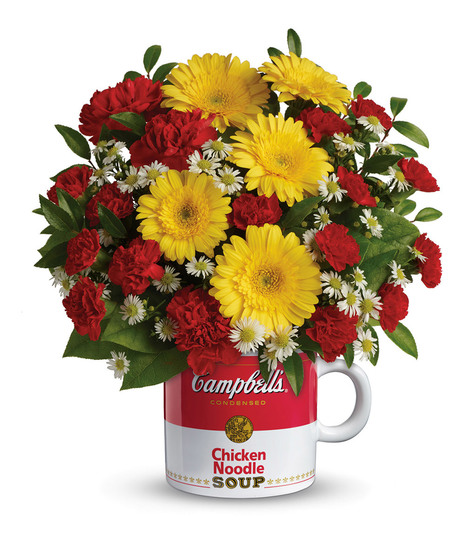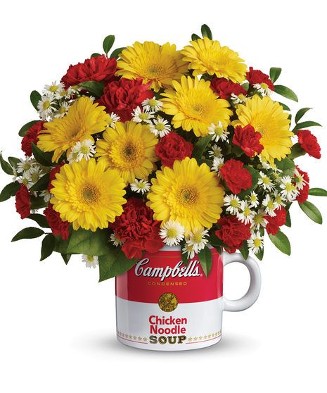 Send your most sincere healthy wishes for a speedy recovery! This beautiful bouquet of bright yellow gerbera daisies and red carnations is perfectly presented in a charming Campbell's Chicken Noodle Soup mug that will be enjoyed for years to come.