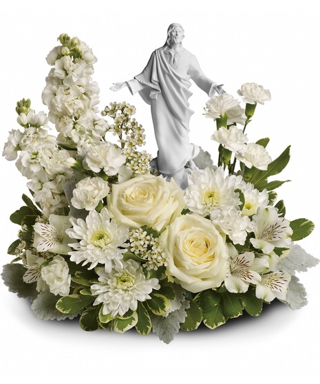 Show them how much you care with this beautifully bright yet reverent arrangement of roses, lilies and alstroemeria. Gracefully presented in a shining, silver-finished ceramic vase with cross cut-out - a touching tribute to a bright life.