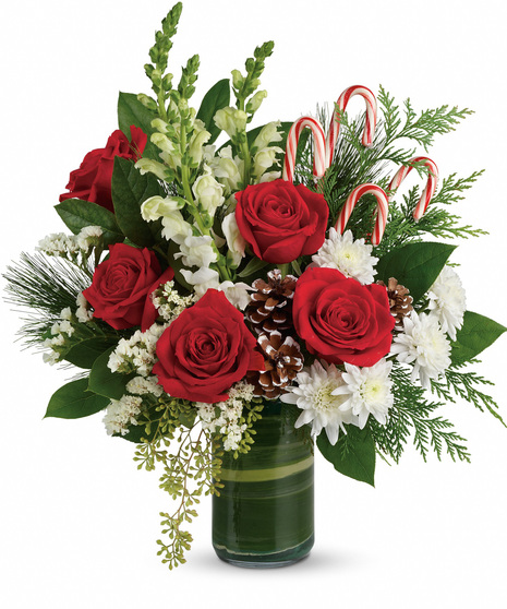 Bursting with Christmas spirit, this lush rose bouquet is accented with candy canes and pine cones for a touch of festive fun.