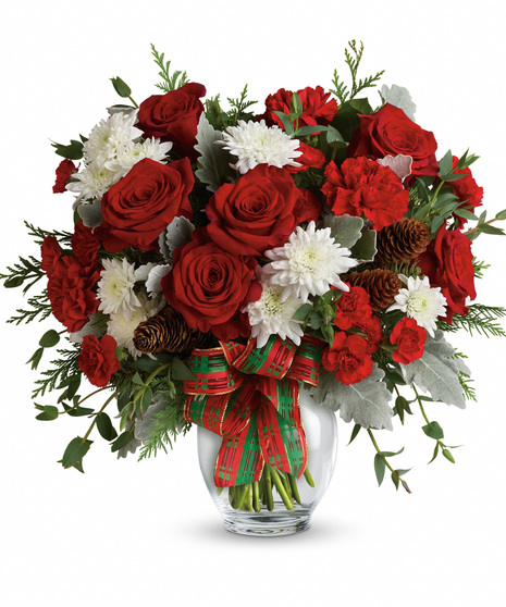 Make their season bright with this fun bouquet of Christmas blooms, hand-delivered in a glass ginger jar and accented with a shimmering holiday plaid ribbon.