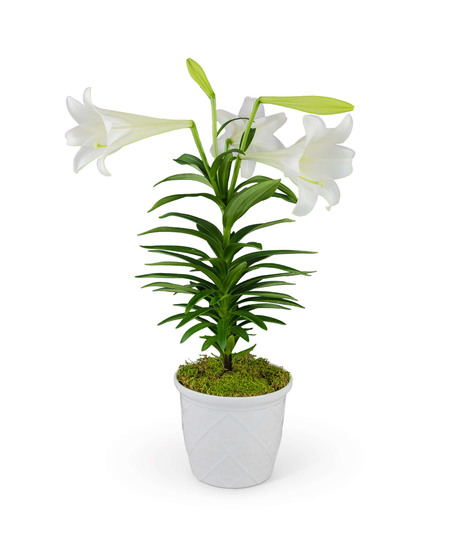 The Classic Easter Lily symbolizes purity, virtue, hope and life. The white trumpeted blooms send out shouts of celebration for the Easter holiday. Send one to the home of a loved one or display one in your own home as a sign of peace and joy.